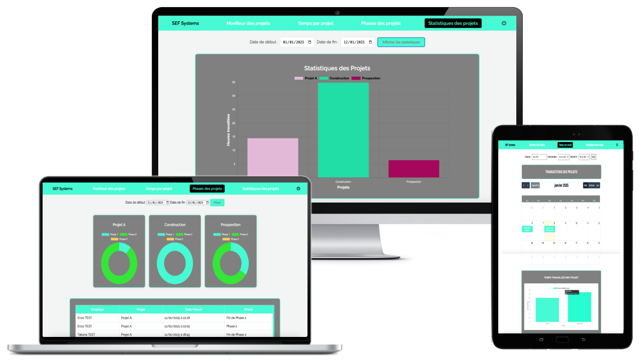 ExplorerGestion de projets, suivi des phases, moniteur en temps réel et statistiques de travail par projet.